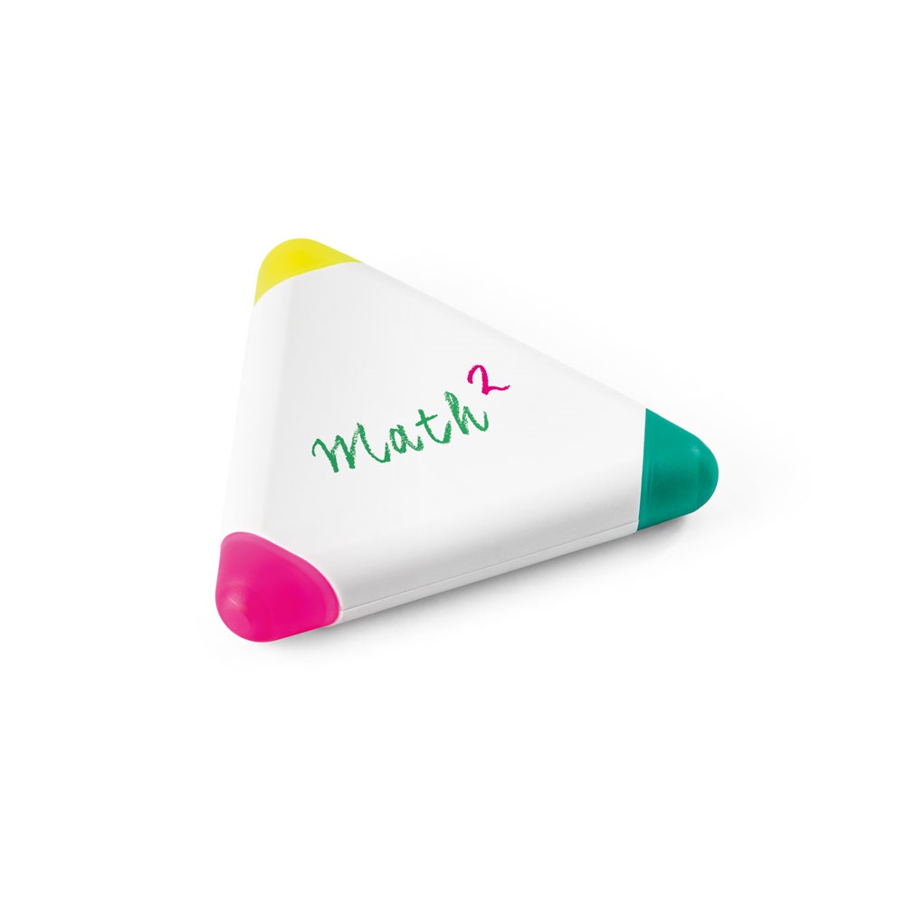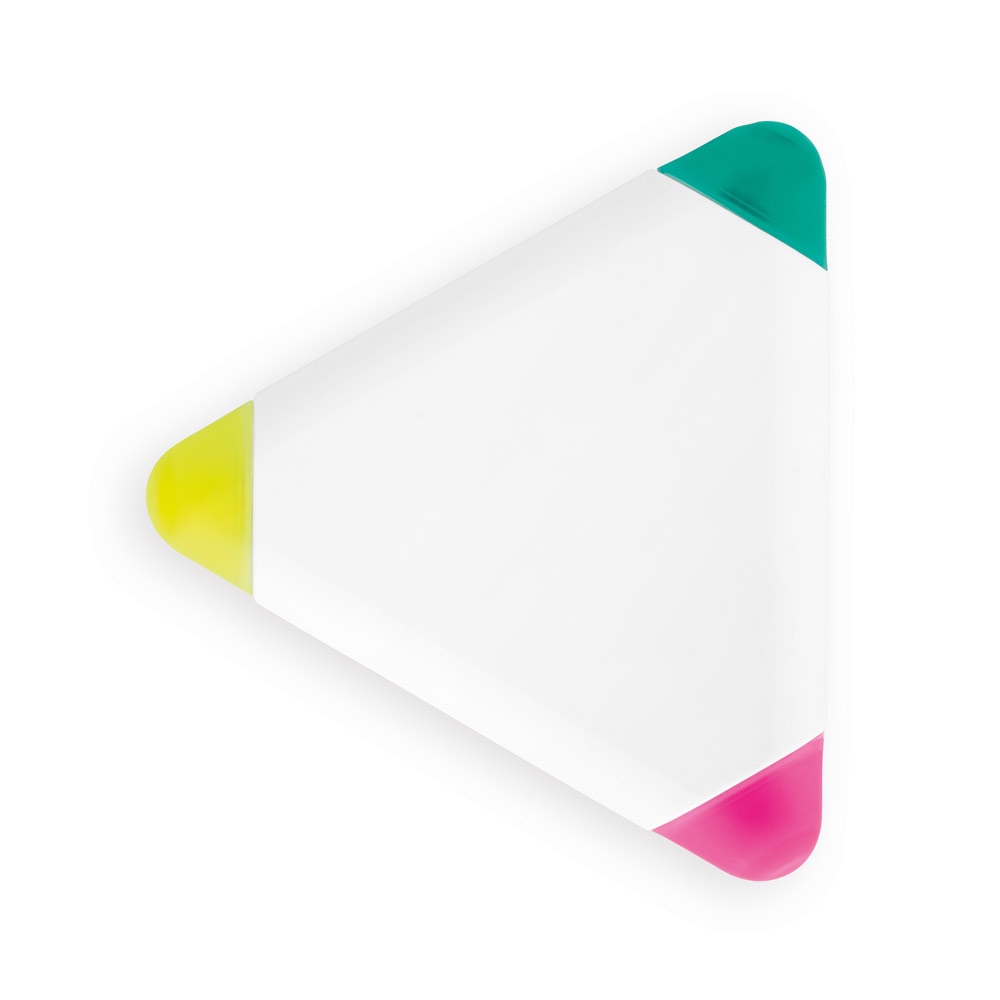 Subrayador en forma de triángulo. Incluye 3 colores: amarillo, rosa y verde. Tamaño: 79 x 79 x 13 mm