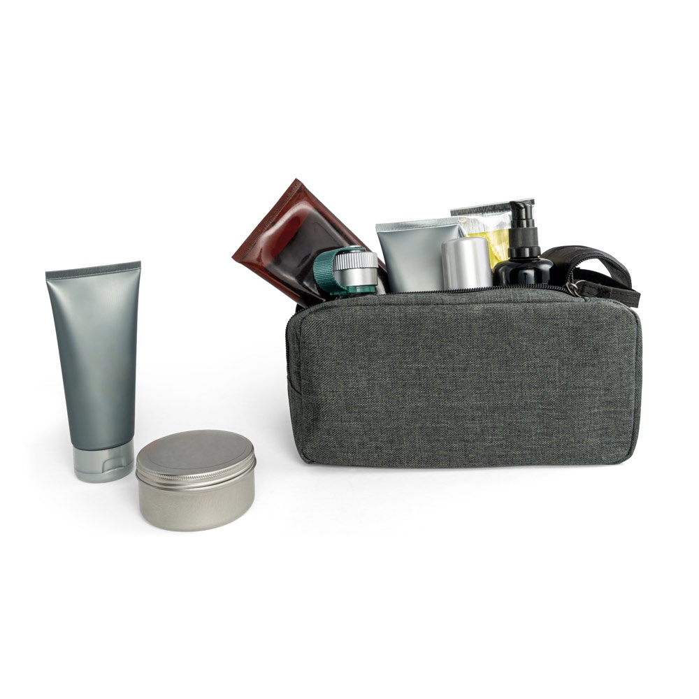 Neceser fabricado en poliéster 300D de alta densidad con asa, cierre doble e interior forrado